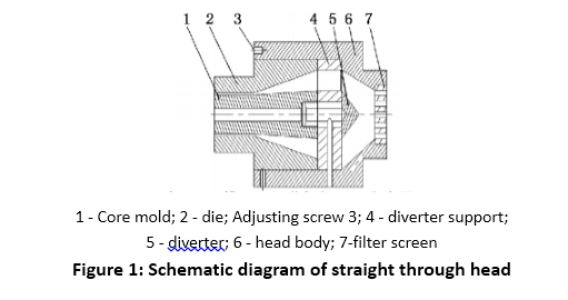 Glava je na splošno sestavljena iz telesa glave, preusmerjevalnika, podpore za preusmerjevalnik, nastavitvenega vijaka, jedrne matrice, matrice itd.glava za iztiskanje ceviso na splošno razdeljeni na ravne vrste, pravokotne vrste, ekscentrične vrste, spiralne vrste in vrste košare. Ravna skozi glavo je najpogosteje uporabljena in njena struktura je prikazana na sliki 1. Glavo lahko razdelimo na naslednje tri dele: telo glave in preusmerjevalnik sestavljata prvi del glave, to je odsek predoblike; Kompresijski del nosilca preusmerjevalnika, matrice in jedra tvorijo drugi del glave, to je kompresijski del; Ravni deli matrice in jedra tvorijo tretji del glave, to je oblikovalni del.