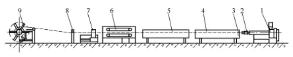 Kot je razvidno iz slike 1, je oprema za ekstruzijo cevi na koncu sestavljena predvsem iz rezervoarja za hladilno vodo,izvlečna enota, rezalnik, navijalec, ali tabelo za odlaganje.