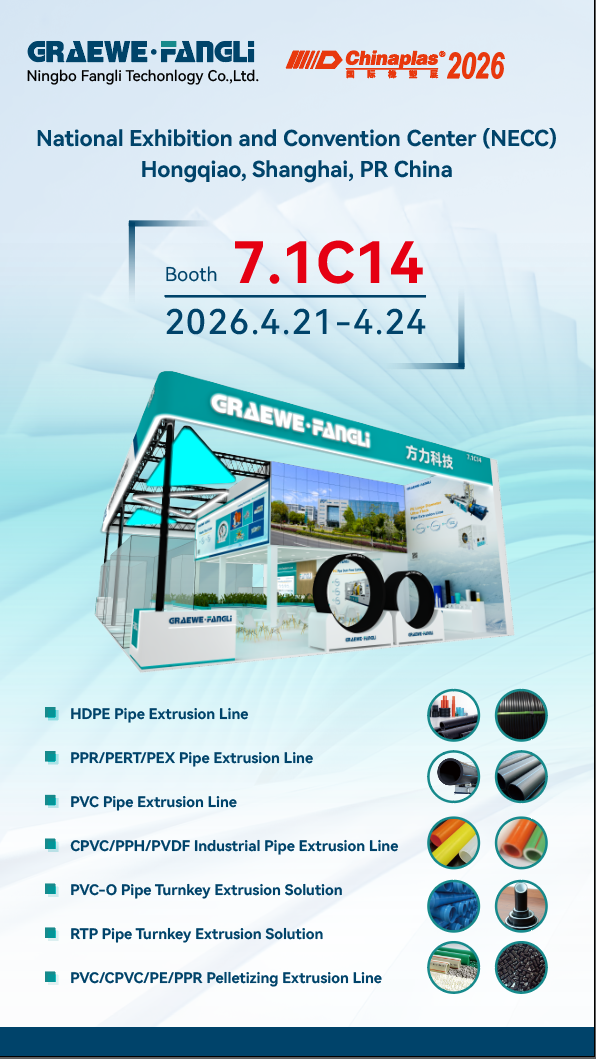 मराठी Dobrodošli na naši stojnici 7.1C14 na ChinaPlas 2026,Ningbo Fangli Technology Co., Ltd.(v nadaljnjem besedilu "Fangli") je specializirano za raziskave in razvoj, proizvodnjo in prodajooprema za iztiskanje plastike, nove okoljevarstvene proizvodne linije, stroji za varjenje plastičnih cevi in pomožni stroji za plastiko.